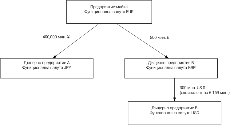 НП1. Настоящото допълнение илюстрира прилагането на разяснението при използване на посочената по-долу корпоративна структура. Във всички случаи описаните хеджиращи взаимоотношения се подлагат на тест за ефективност в съответствие с МСФО 9, макар че самият тест не се разглежда в настоящото допълнение. Предприятието майка, което е крайното предприятие майка, представя своите консолидирани финансови отчети в своята функционална валута евро (EUR). Всяко от дъщерните дружества е притежавано изцяло. Нетната инвестиция на предприятието майка от 500 милиона GBP в Дъщерно дружество Б (функционална валута британски лири (GBP) включва еквивалент на 159 млн. GBP от нетната инвестиция на Дъщерно дружество Б от 300 млн. USD в Дъщерно дружество В (функционална валута щатски долар (USD). С други думи, нетните активи на Дъщерно дружество Б, различни от нетната му инвестиция в Дъщерно дружество В, са 341 млн. GBP.