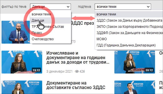 Наличните в БАЛАНС.bg видеоуроци са групирани по теми – например Данъци, Работни Заплати, Счетоводни Стандарти и т.н. А всяка отделна тема е разделена на подтеми, като например темата Данъци е разделена на ЗДДС, ЗКПО и т.н. Ако обясненията на някои лектори Ви допадат особено много и искате да изгледате всички техни видеоуроци, можете да ги достъпите и филтрирате през личните им профили.