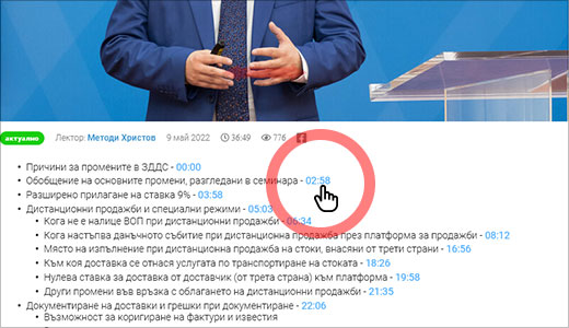 Видеоуроците са адресирани към нормите на съответните закони или счетоводни стандарти, за които се говори в тях, като в свързани документи към член може да видите има ли видеоуроци към него и какво е тяхното съдържание, за да прецените дали ще Ви свършат работа, преди да ги гледате.