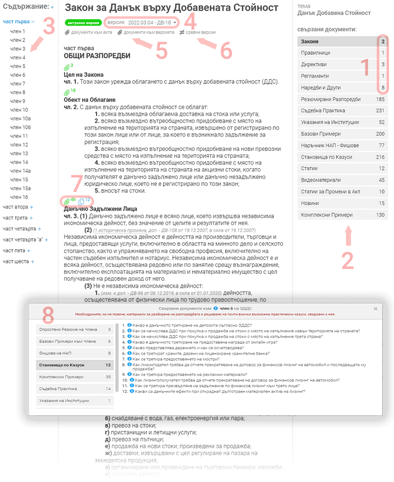 Когато се натисне иконата за свързаните документи към член, те се показват структурирано в допълнително диалогово поле (8). От това поле първо може да се добие представа какви са наличните видове ресурси и второ – да се мине набързо по всеки един вид и да се разгледат заглавията на включените ресурси от този вид. Независимо от вида на ресурсите, пред заглавието на всеки един от тях има инфо икона, чрез позициониране на мишката върху която ще се покаже целият документ или съществено резюмирана част от него. По този начин можете много бързо да прегледате ресурсите и да изберете тези, които най-силно отговарят на Вашите нужди, за да решите конкретен казус.