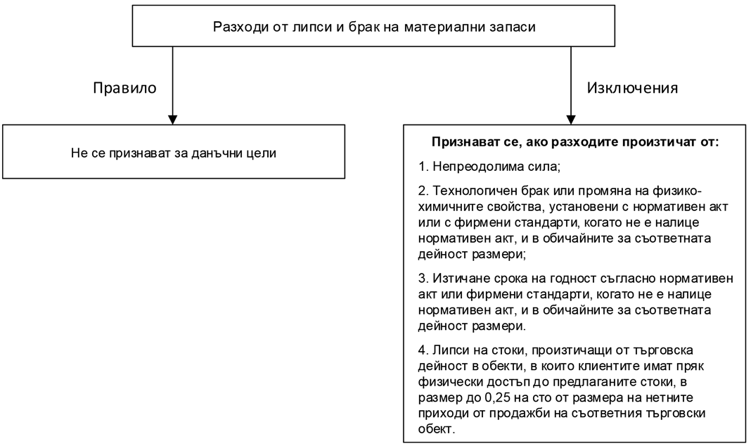 Материалните запаси влизат в състава на краткотрайните активи, но непризнаването на разходите от липси на материални запаси се извършва по реда на специалната норма на чл.28, ал.2 от ЗКПО, а не по реда на ал.1. Също така счетоводните разходи от брак на материални запаси не се признават за данъчни цели (чл.28, ал.2), докато разходите от брак на дълготрайни активи и на останалите краткотрайни активи са данъчно признати.