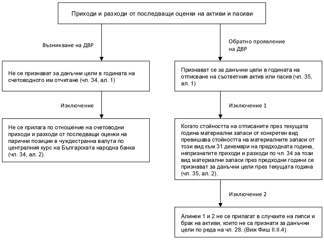 Съгласно чл.34, ал.1 от ЗКПО приходите и разходите от последващи оценки на вземания и разходите от отписване на вземания като несъбираеми не се признават за данъчни цели в годината на счетоводното им отчитане, при условие че в същата или в предходна година не е настъпило някое от обстоятелствата по чл.37 (виж Фиш 2.3.4).