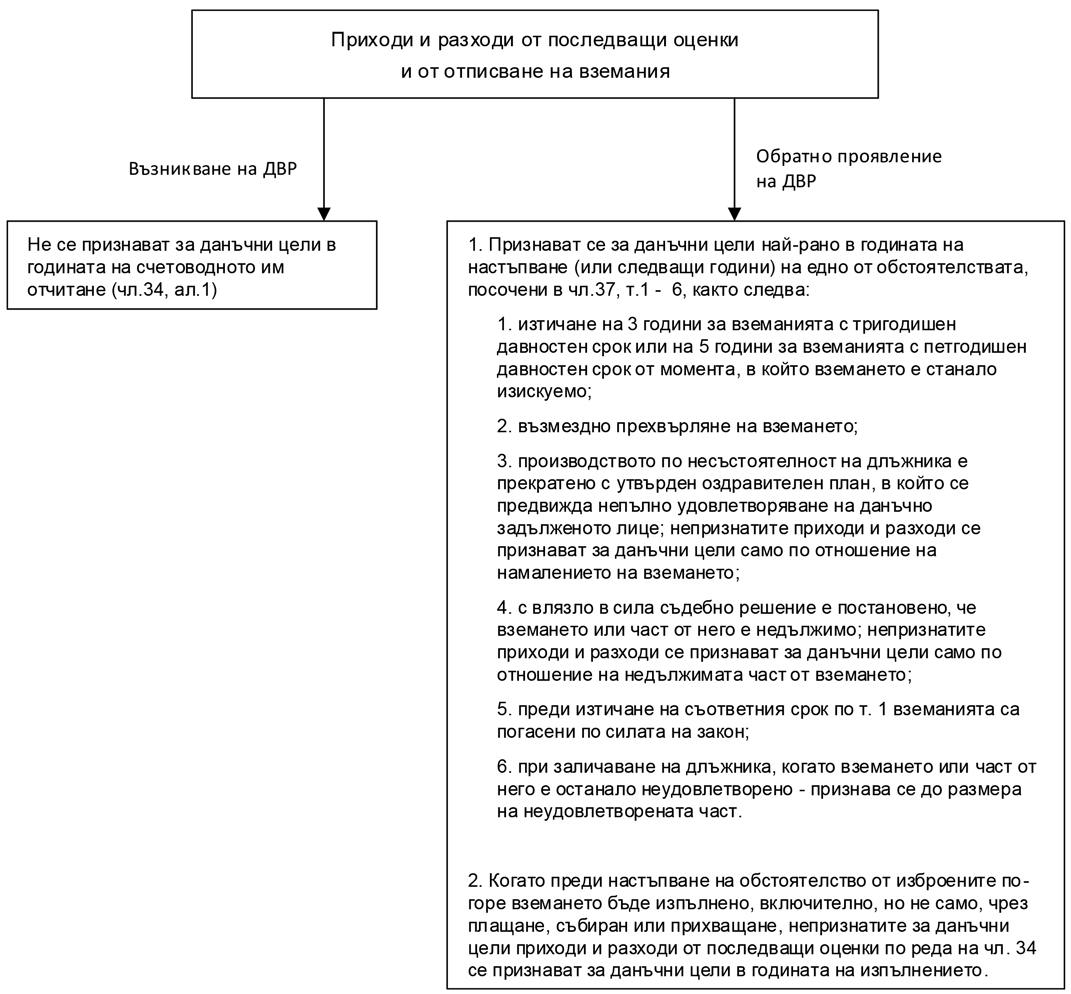 С разпоредбата на чл.37 от ЗКПО се регламентира специфичен ред за признаване на непризнатите по реда на чл.34 приходи и разходи от последващи оценки и от отписване на вземания.