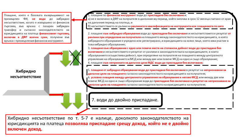 - плащане от хибридно образувание води до приспадане без включване в резултат на непризнаване за данъчни цели на плащането съгласно законодателството на юрисдикцията на получателя;