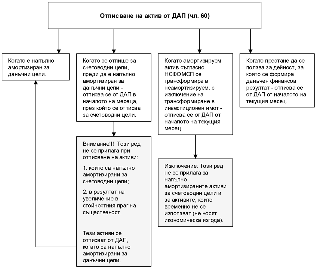 Съгласно §60 от ПЗР на ЗКПО данъчните амортизируеми активи към 31 декември 2007 г., които са отписани за счетоводни цели, но не са отписани от данъчния амортизационен план на основание чл.22, ал.12, т.2 от отменения Закон за корпоративното подоходно облагане, защото от тях не се очаква икономическа изгода, или на основание чл.60, ал.3, т.1, се отписват от данъчния амортизационен план към 1 януари 2008 г. Разпоредбата на чл.66, ал.2 се прилага, включително при определяне на тримесечните авансови вноски за 2008 г. Изречения първо и второ не се прилагат за активи, които са отписани за счетоводни цели, защото са напълно амортизирани.