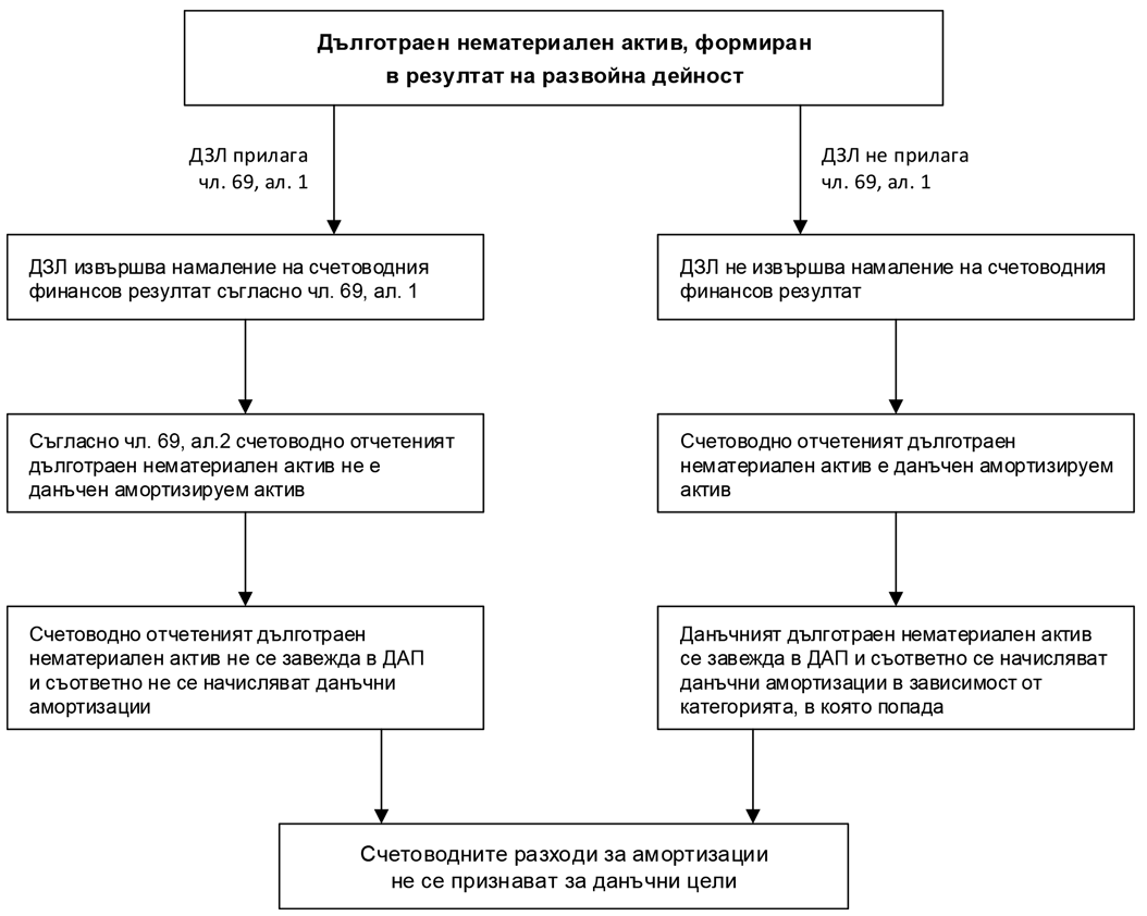 Според ал.2 на чл.69, когато данъчно задължено лице е упражнило правото си по ал.1, счетоводно отчетеният дълготраен нематериален актив по ал.1 не е данъчен амортизируем актив.