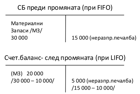 2. До 31.12.Х0 г. при прилагане на FIFO са начислени по-малко разходи за 10 000 лв., в сравнение с разходите, които биха били начислени при LIFO (последна входяща – първа изходяща). Използван е препоръчителния подход за осчетоводяване при промяна в счетоводната политика.