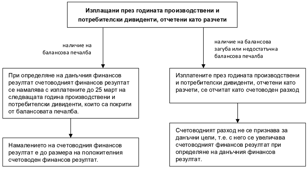 Съгласно чл.99, ал.2 от ЗКПО производствените и потребителските дивиденти, изплащани през годината на член-кооператорите, се отчитат като разчети и не участват при определяне на счетоводния финансов резултат.