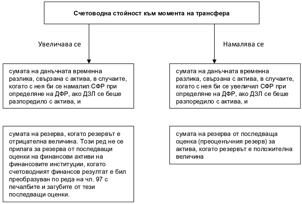 - с данъчната временна разлика, свързана с трансферирания актив и възникнала преди трансфера, не се преобразува счетоводният финансов резултат при определяне на данъчния финансов резултат (не се признава за данъчни цели), и