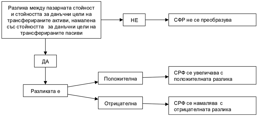 В случай на трансфер на дейност (съвкупността от активи и пасиви на данъчно задължено лице, с които от организационна, функционална и финансова гледна точка може да се извършва самостоятелна стопанска дейност), при определяне на данъчния финансов резултат счетоводният финансов резултат се преобразува както следва: