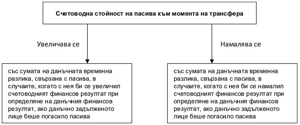 - за пасиви – към момента на трансфера на пасив се формира данъчна временна разлика от последваща оценка или с нея се коригира данъчната временна разлика, свързана с пасива и възникнала преди трансфера, в размера на разликата между пазарната цена и стойността му за данъчни цели (чл.155б, ал.5, т.3 от ЗКПО).