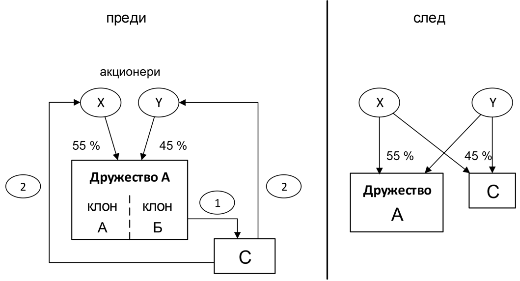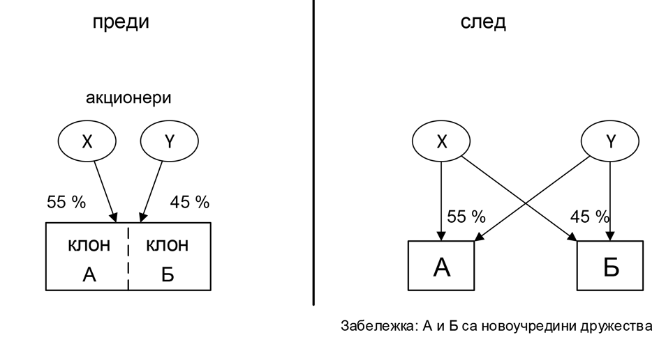 • Акционерът (X) в придобитото дружество заменя част от акциите си в “А” за акции в “В”