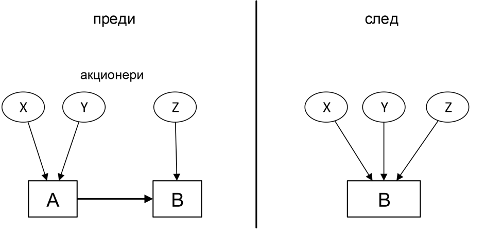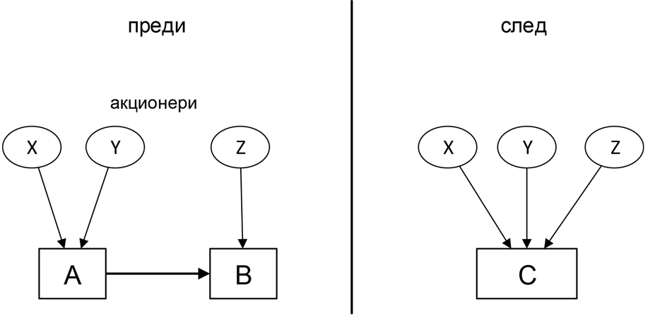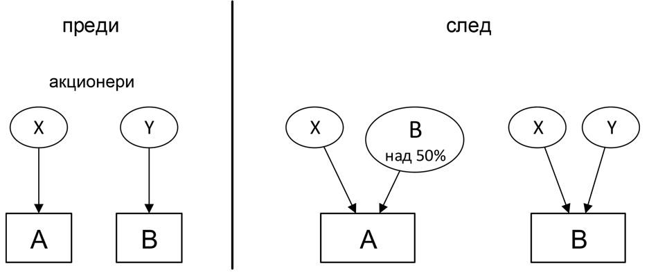• Придобиващото дружество “В” придобива над 50% от правата на глас в придобитото дружество “А”